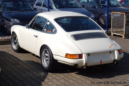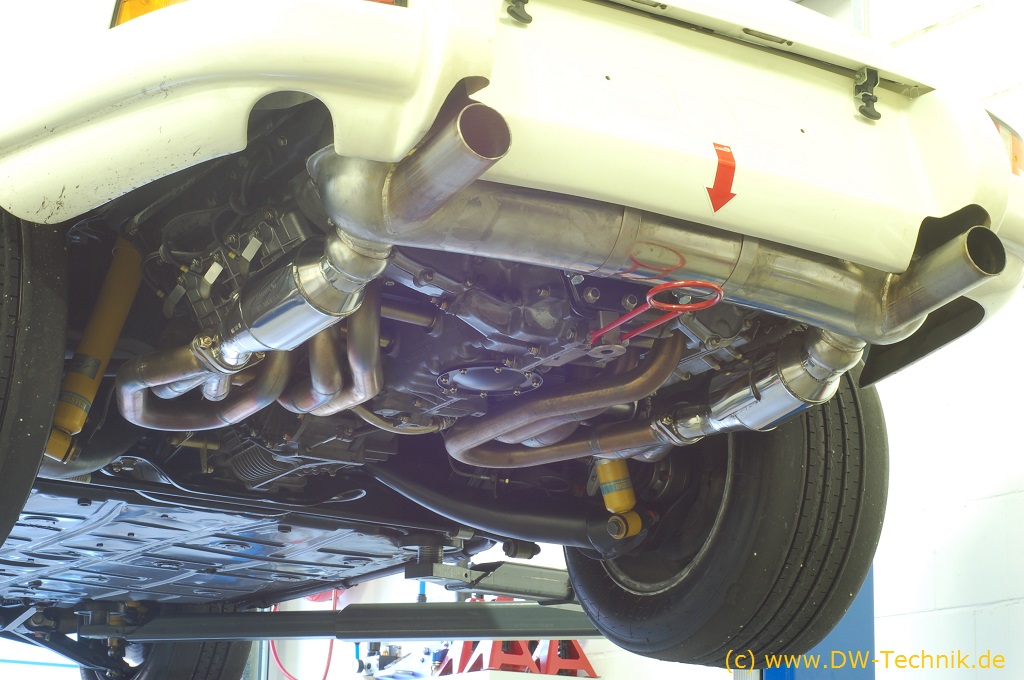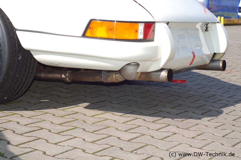 Der weiße Porsche 911 2.5 ST wurde von Kremer Racing für historische Rennen aufgebaut. Für die Rennen nach DMSB-Reglement fehlten noch Katalysatoren, die wir dann zwischen Fächerkrümmer und Endtopf einpassten.