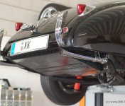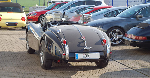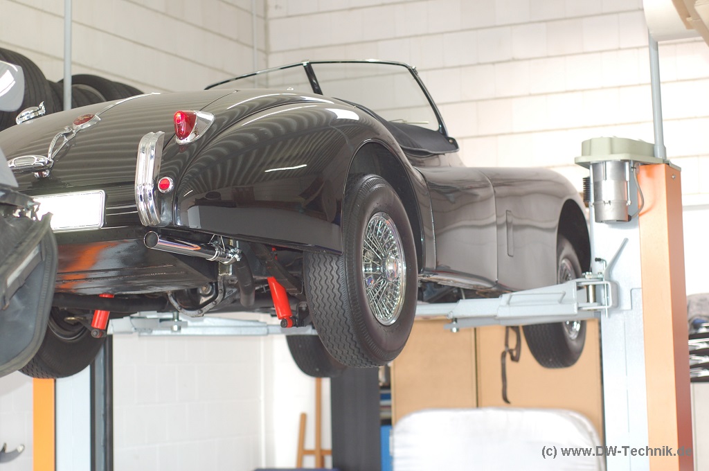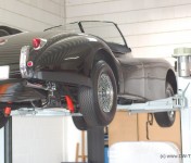 Neuaufbau Jaguar XK120 Baujahr 1955 und auf der Bühne vor ihm ein Porsche 996 GT2, was für Generationen von Sportwagen in einer Halle … was uns erst auf dem Foto (6) auffiel, so hat uns die Arbeit am Jaguar gefesselt.