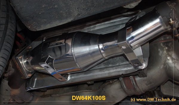 Der Katalysator DW64K100S wird in poliertem Chromnickelstahl geliefert. Belastbarkeit bis 3,8 l / 350 PS. Die Matrix ist doppelt beschichtet, hat 100 cpsi, 1 Lambdasondenanschluß und 1 Prüfstutzen M8.